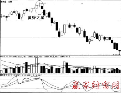 黃昏之星和黃昏十字星相似,區別在于黃昏之星的第二根K線是帶上下影線的極線,而黃昏十字星的第二根K線是十字星。