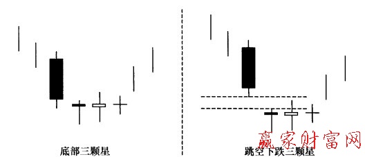 下跌三顆星出現在下跌趨勢的初期或中期,由一根實體較大的陰線和之后在其下端出理的三根小星線組成。下跌三顆星是中繼信號,表示股價將維持下跌走勢。