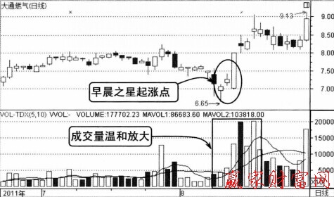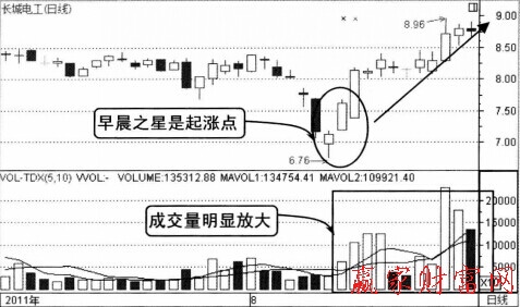 早晨之星K線形態(tài)的出現(xiàn),是該股出現(xiàn)的起漲點(diǎn),由此我們就可以進(jìn)行買(mǎi)入操作。
