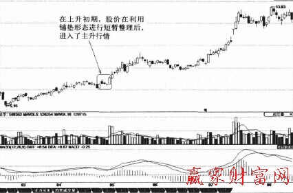 從圖中可以看到,當(dāng)鋪墊形態(tài)出現(xiàn)在股價上升趨勢中時,是主力的一種洗盤整理動作,當(dāng)整理結(jié)束后股價仍會沿原來的趨勢運行,因此鋪墊形態(tài)具有助漲的作用,為上漲中繼信號。投資者在上漲途中見到此技術(shù)形態(tài)時可在鋪墊形態(tài)收出最后一根大陽線時限進做多。