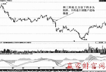 通常倩況下,倒三陽多出現在莊家股上,這是莊家為出逃而設下的多頭陷阱。倒三陽的出現,意味著股價已步入了跌勢,投資者不要受收陽線的迷感,而要趁早賣出股票離場為妙。我們從圖中可以看到,當股價在橫盤整理末期出現倒三陽技術形態后,股價選擇向下突破,這三根陽線便是主力在突破前期進行的誘多。