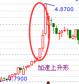 長跑運(yùn)動(dòng)員在最后50米或100米總會(huì)有一個(gè)加速的沖刺,股市中也有類似的情況。如果說股價(jià)的上升過程是一個(gè)長跑的話,那么頂峰便是終點(diǎn)。當(dāng)股價(jià)快要抵達(dá)頂峰時(shí),上漲的幅度就會(huì)越來越大,就像運(yùn)動(dòng)員在比賽的最后階段加快了步伐一樣,所以在股價(jià)走勢圖上就會(huì)出現(xiàn)加速上升形形態(tài)。