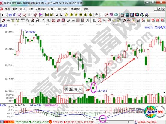 在陽線出現之后,K線終止了下跌趨勢,開始反彈上漲,走出了一波比較強勢的上升行情,不就macd在零軸之下比較遠的位置拐頭向上,形成了金叉,這就符合了孤軍深入形態的第三個條件。