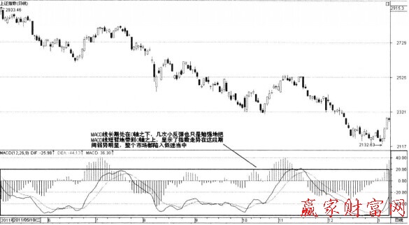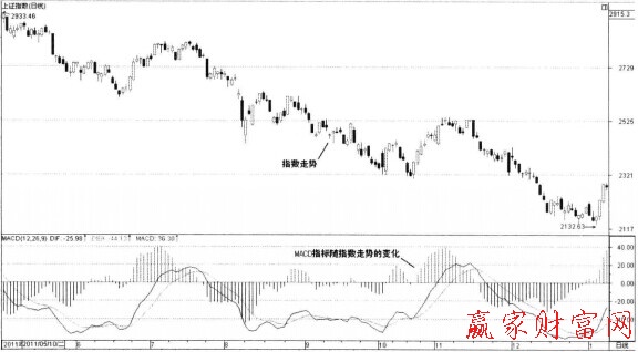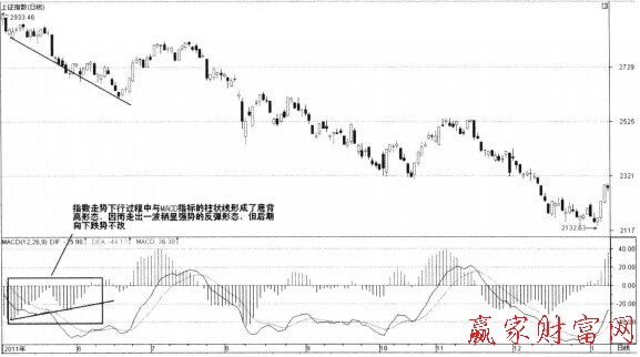 在指數(shù)走勢中,日K線周期中的MACD指標表現(xiàn)得十分靈敏,對于趨勢的變化有很迅捷的提示,但在準確性上會使得部分常用的指標性形態(tài)大失本色。在日線周雙中,MACD指標的金叉和死叉相對而言反應(yīng)遲鈍,柱狀線的萎縮放大特征出現(xiàn)得更快,但在準確性上頻繁出現(xiàn)誤區(qū),而最穩(wěn)健的指標信號就是背離,雖然也有騙線,但不可否認其意義。如圖下圖所示,是指數(shù)走勢與MACD指標的形態(tài)示意圖。
