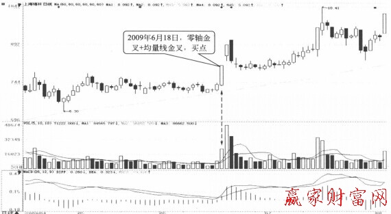 這是因為,零軸附近的金叉,往往出現在一段先上漲、再回調的走勢之后。此時的金叉,預示著調整行情已經結束,新一輪上漲行情已經開始。此時如果還伴隨著均量線的金叉,就說明股價的上漲得到成交量的支持,買入信號將更加可靠。