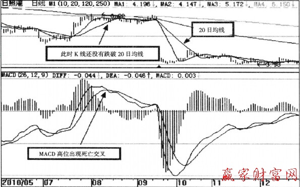 2.投資者在股價(jià)K線向下跌破20日均線后,在謹(jǐn)慎持股同時(shí)密切關(guān)注MACD指標(biāo)動(dòng)態(tài)。如果在這幾天內(nèi)遇到該股MACD指標(biāo)出現(xiàn)高位死叉時(shí),應(yīng)當(dāng)及時(shí)短線賣出,短線選股的知識(shí)也是很重要的。當(dāng)MACD指標(biāo)出現(xiàn)高位死叉并且股價(jià)K線也出現(xiàn)跌破20日均線時(shí),這就是日MACD與日均線同時(shí)發(fā)出賣出信號(hào)。投資者可根據(jù)這兩種更為可靠準(zhǔn)確的賣出信號(hào),進(jìn)行中短線賣出股票操作,如圖所示。