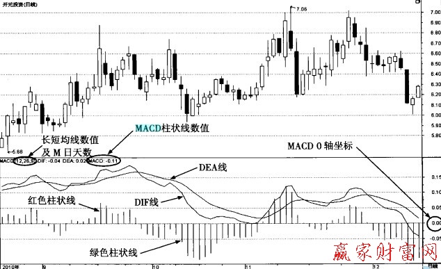 2.DIF線、DEA線均為正值,DIF線向上突破DEA線形成金叉,為可能的買入信號;DIF線、DEA線均為負債,DIF線向下跌破DEA線形成死叉,為可能的賣出信號。