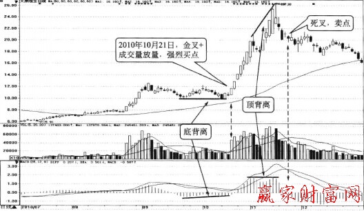 如圖所示,2010年10月21日,太原剛玉(000795)的MACD指標現“MACD柱線與股價底背離+金叉”的買入信號,同時成交量也突然放出巨量,均量線指標出現金叉,投資者可以果斷買入。