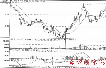 上圖股價經過大幅調整后,空方能量基本消耗殆盡,多方能量逐步增強,在雙方較量過程中60分鐘MACD在0軸下方形成黏合狀態。不久,60分鐘MACD向上發散,BAR紅柱產生并逐日增長,形成多頭信號,此時60分鐘MACD也已經出現底背離走勢,5時均線與10時均線也出現金叉信號,30時均線向上移動,做多信號比較明確。