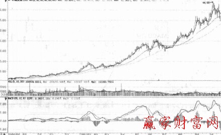 如圖所示為中海發展(600026) 2006年8月至2007年10月期間的走勢圖,此股在此期間處于上升趨勢中,移動平均線呈多頭排列形態,對于多頭買入的知識大家也要做一下了解,即周期較短的移動平均線運行于周期相對較長的移動平均線上方,根據MACD指標的計算方法,我們可以知道此時MACD指標的計算結果應是正值,因而上升趨勢中的MACD指標線在大多數時間內是位于0軸上方運行的,這就是MACD指標線對于上升趨勢的直觀反映形式。