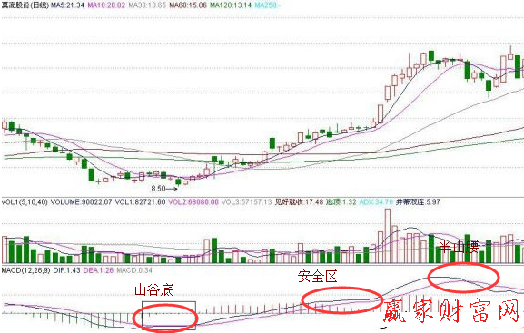 一般說(shuō)來(lái),迫求資金安全、偏愛(ài)長(zhǎng)線的投資者應(yīng)該選擇山谷底MACD雙線合一型個(gè)股;而喜歡冒險(xiǎn)、偏愛(ài)短線的投資者除了可以選擇山谷底和安全區(qū)MACD雙線合一的個(gè)股外,還可以用超短線的手法去追擊半山腰MACD雙線合一的個(gè)股,但務(wù)必要快進(jìn)快出。