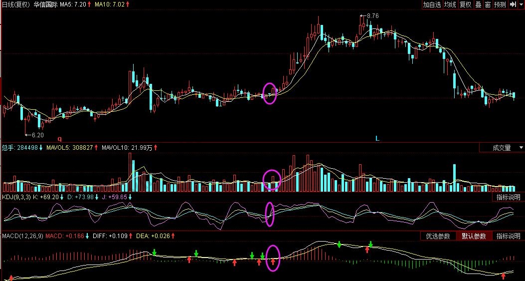 四喜臨門綜合四個指標:均線,MACD,KDJ,均量線,這四個都是在實戰操作中,我們會經常使用到的指標工具。依據這四個指標共振判斷個股,操作的成功率將會更高,股票出現大幅上漲的概率也大。