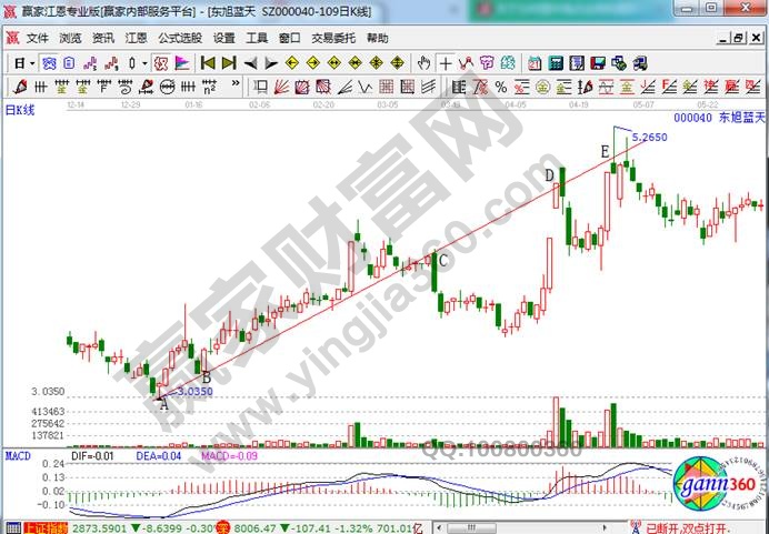 上面是東旭藍天在12年年初到12年5月份的走勢圖,從圖中我們可以看到:股價從A點反轉向上,可以畫出一條上升趨勢線。在上升趨勢線沒被破壞之前,可以持續做多,此后該股在C處長陰線跌破上升趨勢線,原有的上升趨勢線已經是被破壞了,所以需要重新確定。