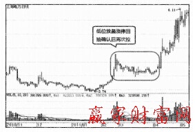 圖1、圖2分別為低位漲停立即拉升和低位漲停后回抽確認(rèn)再次拉升。