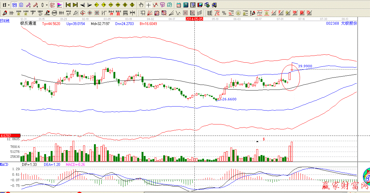 002368前期在生命線上強勢運行,但是此時沒有成交量的配合,后市空間沒有打開。之后大陽線拉升實現向上的跳空,股價開始強勢運行,成家量的配合下,運行一直很強勢。站穩強勢外軌線之后看向超強外軌線。