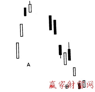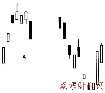 還有一空、二空、三空這些說法,如圖1中A所示,在上開市場中,第一條K線和第二條K線之間是第一個空跳缺口,稱為一空,第二條K線和第三條K線之間是第二個空跳缺口,稱為二空。相反,圖1中B所示,處于下跌市場,一空在第二條K線和第三條K線之間,二空在第五條K線與第六條K線之間,三空在第六條K線與第七條K線之間,總共形成三個空跳缺口。