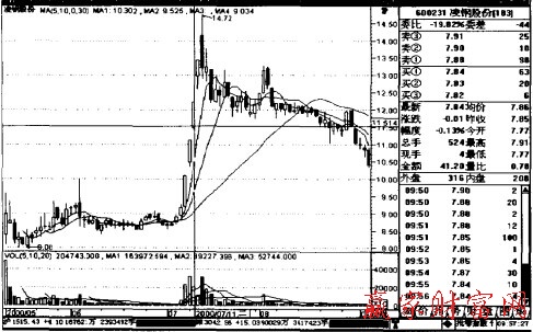 比如2000年7月11日凌鋼股份(600231)出現(xiàn)第二個(gè)上跳測(cè)量缺口,下沿在11.50元左右,而前期的平臺(tái)是8.5元左右,已漲3元,但用測(cè)量缺口計(jì)算還能再漲3元,即11.50元加上3元等于14.50元。而實(shí)際上此股在發(fā)生第三個(gè)缺口的第二天,即7月13日摸高14.72元后掉頭而下,僅比測(cè)量性缺口測(cè)出的理論高度高出0.25元,如下圖所示。