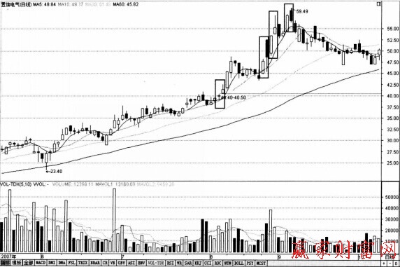 如下圖所示的置信電氣(600517),股價在上漲的過程中,在短短的一段時間內便出現了4次跳空。除了第一次跳空沒有回補外,其他三次均在當日或次日進行了回補,這預示著多方在進行著最后的勢力。該股的走勢正如預期的那樣,在第四次跳空出現后,股價便進入了下跌通道。