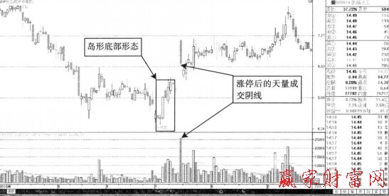 如圖所示,氯堿化工持續(xù)回落過程中,見底回升的島形底部早已經(jīng)形成了。相應(yīng)的成交量,也出現(xiàn)比較明顯的放大。而股價(jià)跳空拉升的一字漲停板完成后的第二天,股價(jià)出現(xiàn)了天最大陰線的K線形態(tài)。這樣看來,后期股價(jià)的放量沖高還是非常值得期待的。天量出現(xiàn)的背后是該股島形反轉(zhuǎn)后的持續(xù)看好的行情。