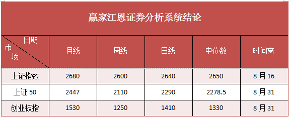 江恩理論時間周期結(jié)論,上證50周線時間變盤時間8月31(本月最后一周),滬指周線時間變盤時間是8月16(本月第三周),創(chuàng)業(yè)板周線時間變盤時間8月31(本月最后一周)。