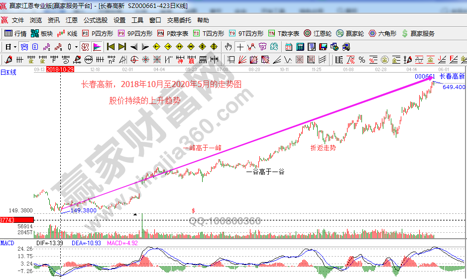 對照長春高新2018年10月至2020年5月的走勢圖去看,股價創出149低點后,持續攀升至今。期間走勢,波峰一個高于一個,波谷也逐步抬高,近1年半的長期時間跨度內,雖有小的折返運行,但走勢上呈現出明顯的上升方向。這種整體向上運行的態勢就是上升趨勢。