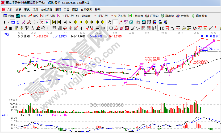 對照同益股份的極反通道圖去看,趨勢方向一目了然,下跌趨勢的拐點在藍線精準展現,盤整趨勢在黑線買藍線賣有效把握短線利潤,進入上升趨勢,目標方向提前知曉,只需要做好應對策略即可。更多趨勢研判應用,詳詢贏家客服。