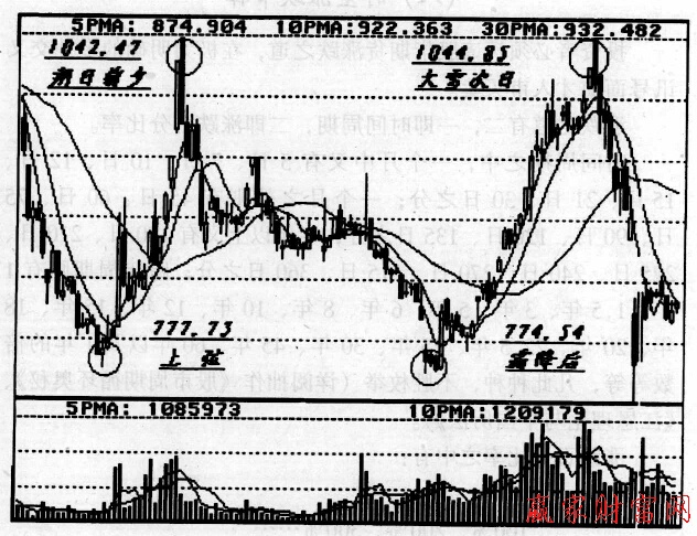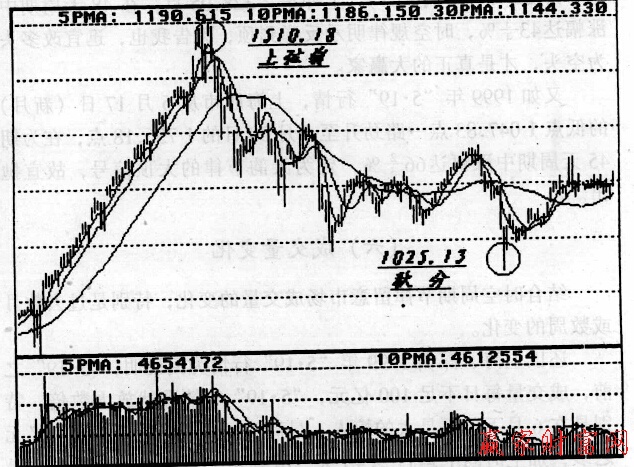 上海綜合指數(shù)的籌碼分布指標(biāo)從1997年5月12日(上弦前)的高點I510.18點暴跌而下,至9月23日(秋分)的1 025.13點,一路下跌,運行135天,跌幅深達33十%,熊市已兆。