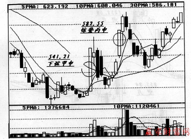 1995年2月(正月)下弦甲申日,滬市大盤(pán)放出大陽(yáng),大漲53點(diǎn),次日又漲。12天后的驚蟄丙申日,又先后3天發(fā)力上攻,形成典型的十二地支與朔望節(jié)氣交互作用現(xiàn)象。知乎此,當(dāng)在酉日拋空。否則,幾日大幅回調(diào),會(huì)使到手的利潤(rùn)化為無(wú)有,甚或被高位套牢。