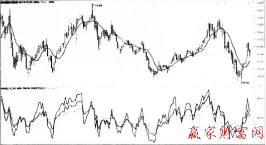 (2)一般來說,RSI指標在50以上可以看為強勢,50以下為弱勢。假如RSI指標由50以下的弱勢區,向上突破50的強弱分界線,這通常表示股價已轉強,相反,如果RSI指標由原本處于50中軸線以上的強勢區,向下跌破50強弱分界線,這通常表示股價已轉弱。