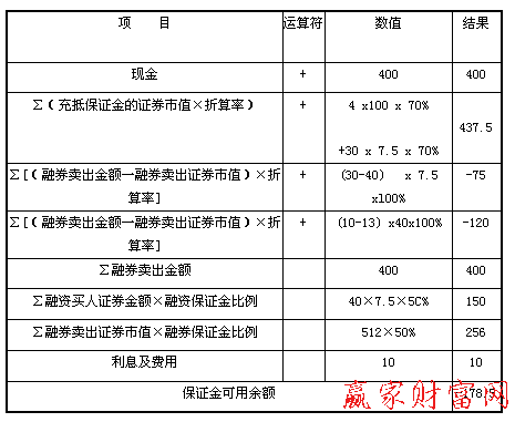 假定以8元/股全部賣出A股票50萬股,以30元/股賣出B股票10萬股,共計(jì)得款700萬元。還款后保證金可用余額計(jì)算如下表。