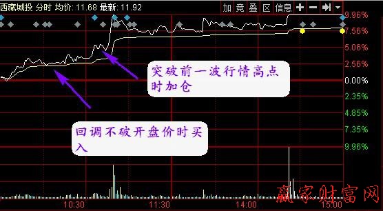 一、高開高走的走勢,在回調的時候不破開盤價時候買入,突破行情高點的時候加倉。