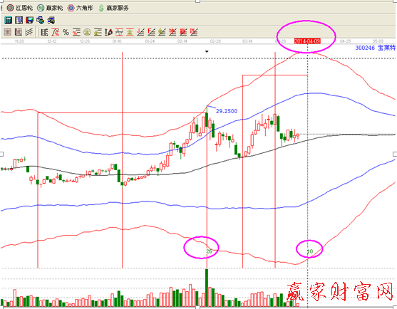 首先我們可以看到,300246從2013年12月5號到2014年1月13號橫盤整理,到1月13號這一天,市場發(fā)生翻轉(zhuǎn),開啟一波拉升,直至2014年2月25結(jié)束上升趨勢,市場再次發(fā)生翻轉(zhuǎn),前后兩波趨勢個(gè)股各自運(yùn)行26個(gè)交替日,時(shí)間相差無幾。由此我們可以知道,當(dāng)個(gè)股運(yùn)行到重要的時(shí)間點(diǎn),市場就將發(fā)生趨勢轉(zhuǎn)變。