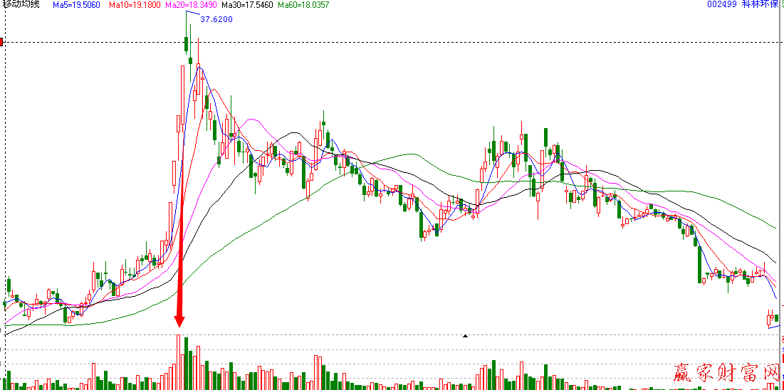 002499科林環保屬于機械行業板塊,節能環保行業板塊,近期環保之風盛行,節能環保板塊穩步上漲,板塊漲幅0.25%,個股方面科林環保領漲,其他個股緊跟其后。在2013年10月18日,科林環保個股當天成交量創出短期新高,當天股價收小陽線,之后的第二天開始創出31.32的高點,也就是我們所說的天量之后出現天價,這一高位天量也預示著風險。我們觀察高點吊頂小陰線實體,也可以判斷股市見頂,此時應該及時離場。