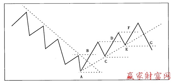 從圖中的下降趨勢突破下降趨勢線并突破前期高點時(B點),交易者認為符合123法則,決定執(zhí)行突破買人策略,將止損定在前期低點(A點)稍下處。如果價格開始網(wǎng)調跌破A點,那就說明下降趨勢并沒有真正反轉,只有價格回調至C點后開始繼續(xù)上升,直至價格突破前期高點后才能上調止損(突破點為D點,止扭從A點上移至C點稍下方)。按照這種思路,交易者必須耐心等待價格的再次有效突破才能確定上升趨勢的延續(xù).如果價格回調后過度,跌破前期的低點(比如圖中的價格在G點跌破前期的低點E點),那就意味著該趨勢可能會發(fā)生變化,或者市場面臨更大的回調后繼續(xù)上升。不管怎樣,觸發(fā)止報后就表明本次交易告一段落,交易者還要耐心等待下一次進場信號的出現(xiàn)。