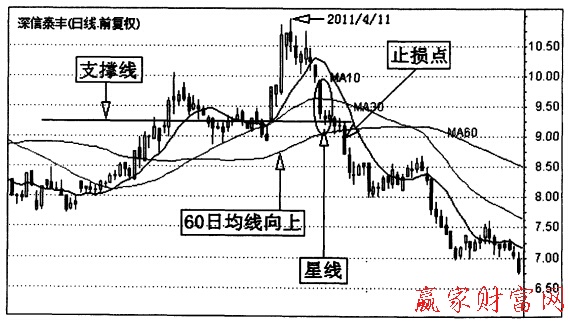 圖是深信泰豐(000034)的一段日K線走勢圖。在這段行悄中,2011年4月11日之前,市場走出了一個逐步抬高的中線上漲行悄,中短期均線由向下轉為向上運行,形成多頭排列。市場回調后,在看漲星線位皿,股價受到空間支律線和MA60的雙重支撐.因此有理由在這個位置進行短線波段操作。但是市場后來的走勢并沒有按照投資者的意原運行,隨后兩天市場向下跌破MA60,進人大幅殺跌的走勢中。