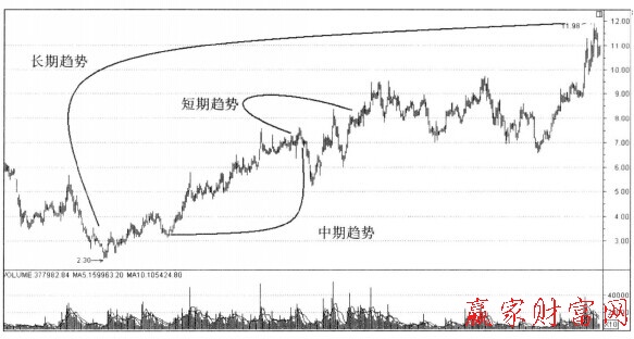 追漲是一種順勢操作方法,是短線高手在牛市獲利的最重要要的方法之一。投資者宜勢應建立在對趨勢的理解之上。投資者必須認識和判斷股市變動的三種趨勢。如圖所示。