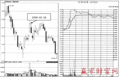 上圖為皖新傳媒(601801) 2010年5月28日的漲停板分時圖,圖中左側(cè)是此股在2010年5月28日前后的走勢圖,當(dāng)日此股處在一波反彈上漲走勢之后,因而面臨著一定的解套拋壓。從當(dāng)日的分時圖中可以看到,此股在早盤時間段出現(xiàn)了快速上封漲停板的走勢,但這種漲停板僅僅維持了十幾分鐘,隨后就被大單打開。考慮到此股正處于階段性反彈上漲之后,這既有可能是市場拋壓較為沉重的表現(xiàn),也有可能是莊家誘多出貨的一種手法。在實盤操作中,這類個股一般還會出現(xiàn)一波短期調(diào)整。因此,此類股并不是我們短線追漲的理想品種。