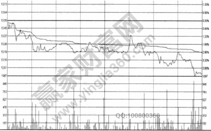 從這個圖形走勢中,我們可以看到賣方拋壓是非常明顯的。分時圖顯示開盤30分鐘內股價出現兩波快速跳水,并且在跳水過程中都有量能的放大,空單明顯占優,顯示盤中賣方占據主導低位。雖然之后出現四組半小時的橫向整理動作,但通過下面的量能變化可以清楚地看到依然有不少大賣單放出,由此可以感覺到股價正在遭受極大的拋壓。