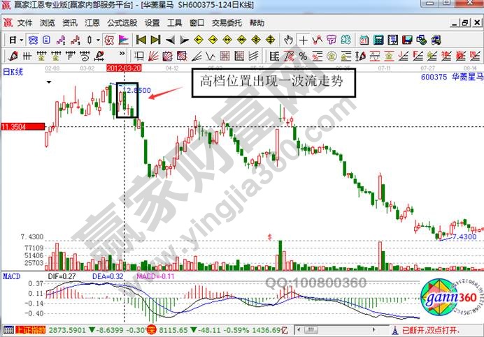 關于高位出貨一波流的分時走勢特征就介紹到這里,下面我們就來看華菱星馬的實戰案例走勢分析。下圖是該股在2012年3月份的日K線走勢圖。
