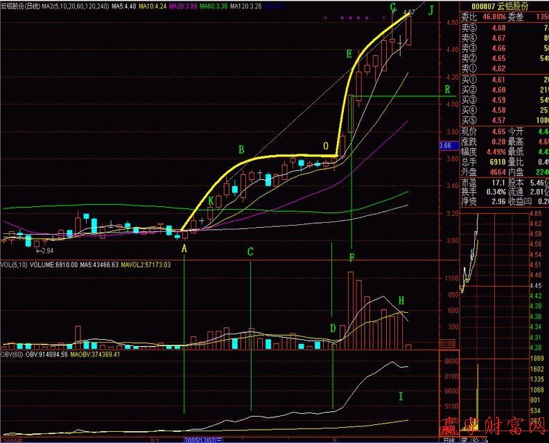 第四:F點是巨量收集籌碼,對應(yīng)的E點,是K線拉長陽。一般人會以為股價漲幅已大,就不追著買進,這是認識誤區(qū)。實際情況是莊家急吼吼地野蠻建倉,正好暴露了莊家的操盤決心。你要想到,股價離60日、120日價格平均線并不遠,莊家前期的建倉還不可能出貨。而現(xiàn)在的巨量形成了大陽線,這也不可能是出貨量。既然不是出貨量,那么如此大的成交量是什么量呢?只能是建倉量!出貨在哪里呢?一般認為是建倉量所在地價格的N倍。本圖中大量收集籌碼的價格約在4.05元(見圖中的R點),就以漲兩倍計算的話,出貨空間應(yīng)在8.10元以上。