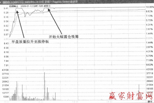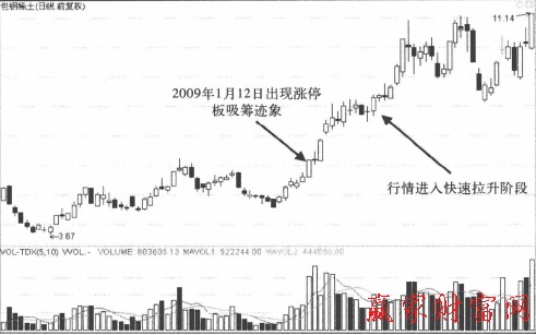 在拉升初期的洗盤過程中,主力在建倉結束后要進入快速上漲的主升階段,這個時候還有不少籌碼在別人手里,主力就邊拉升邊洗盤。我們看下包鋼稀土在2009年年初的拉升行情,如圖1和圖2所示。