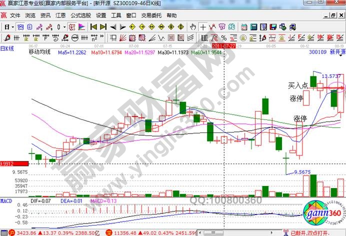上圖是新開源的2011年8月份的走勢圖,從圖中我們可以看到,在底部出現(xiàn)了兩天強勢漲停,之后股價沖高回落,已經(jīng)跌到了第二個漲停板的開盤價。這個股票在最后一根K線的時候是低開,并且在當天迅速的拉升向上,當股票拉升到最近的漲停價的時候就是好的買入時機,強勢股回調(diào)到拉升前一個漲停時很有可能再次上漲,所以在短線上就可以做T+1了。